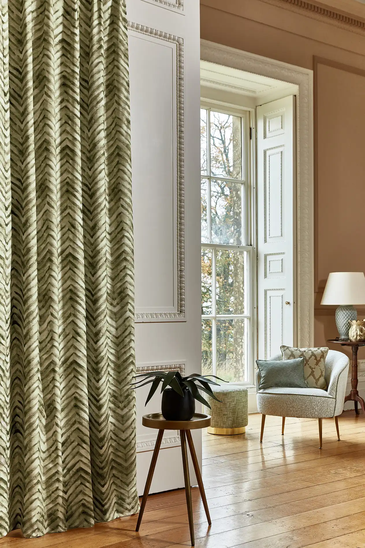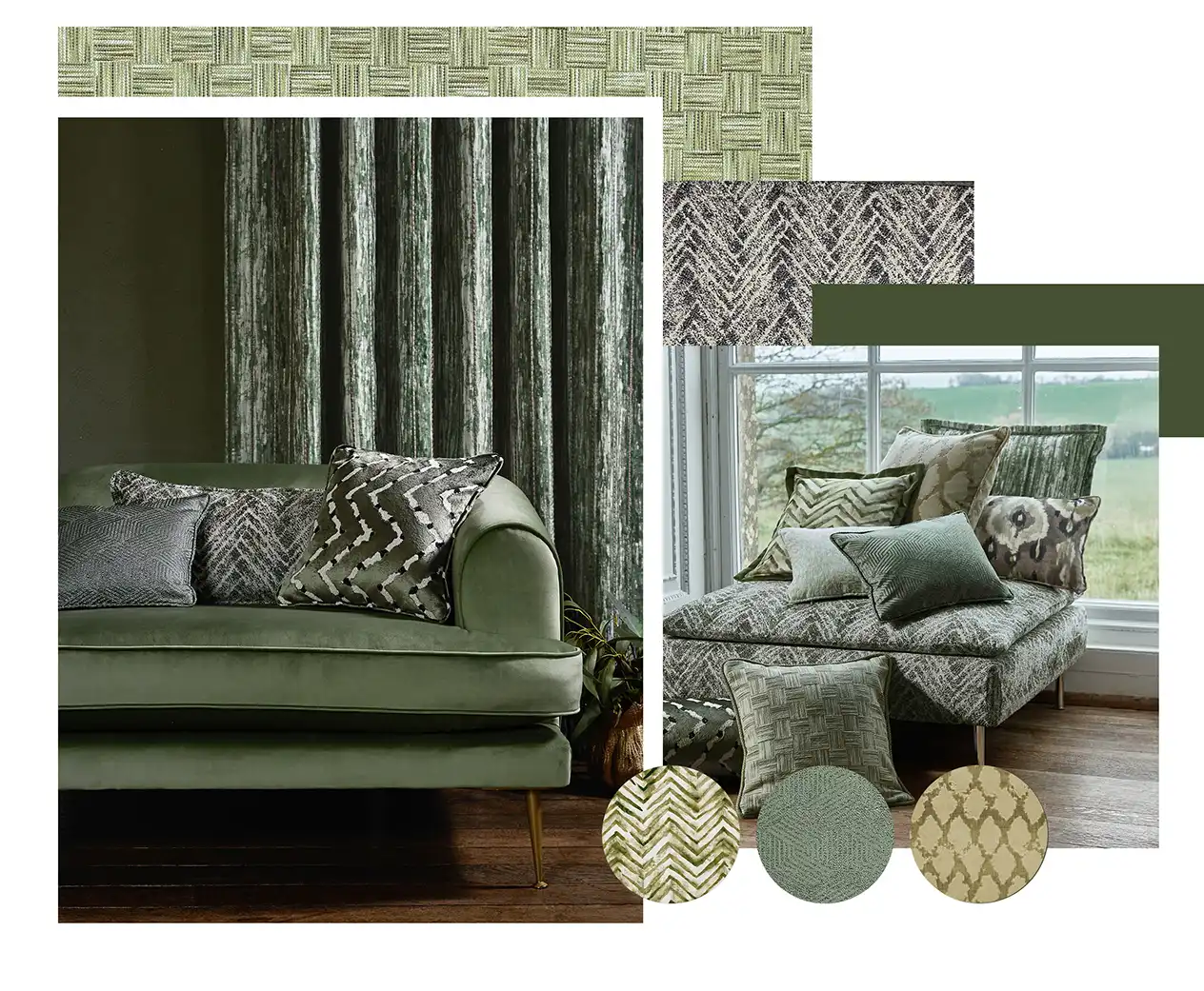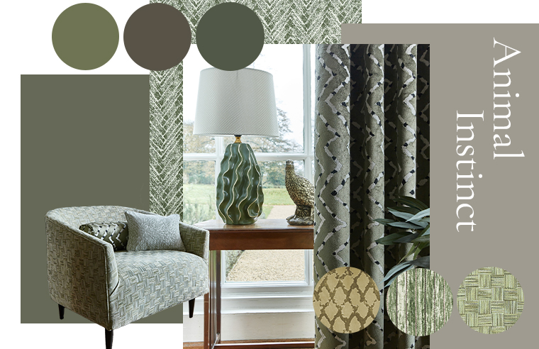 Select an eye-catching fabric for the main attraction. Present this on curtains, upholstery, or even on a large footstool. Use a linear design on a curtain, such as an on-trend zigzag design. These draw the eye upwards and make the room feel larger. Use a geometric weave on upholstery for a cosy yet striking feel. Combine the two for cohesion. Add finishing touches with scatter cushions. Speckled, animal-effect jacquards or leopard-effect designs embrace the animal print style.