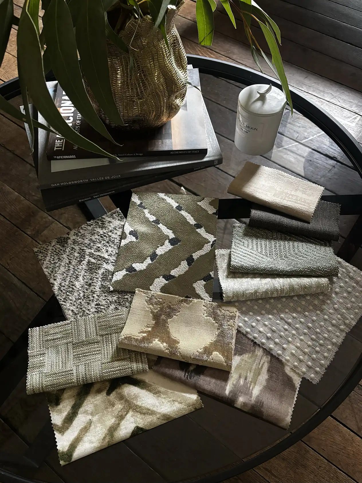 Combine eye-catching prints with tactile designs for depth and interest. Think plush velvet, checkerboard weaves, and luxurious jacquards. Add in hints of metallic such as brushed gold, through furniture and hardware. Include other materials such as stone and tile. Present through planters and accessories.