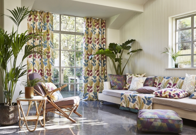Team the foliage-inspired designs with modern geometrics to inject a contemporary feel into laid-back living spaces. Pair these eclectic designs with plain fabrics, such as our upholstery-weight chenille Talu, in coordinating colours to add texture into an interior inspired by the tropics.